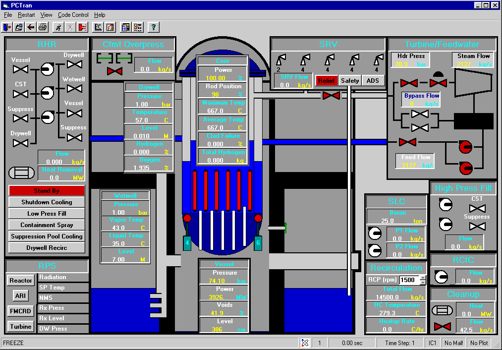 The simulation can be stopped (Freeze) and started (Run) by the