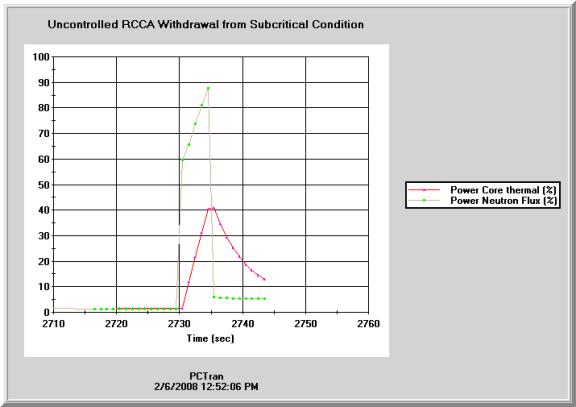 The rod withdrawal is introduced by a 4%dk/k reactivity insertion in 30 second ramp time. The reactor is then tripped by high flux signal at low power condition.