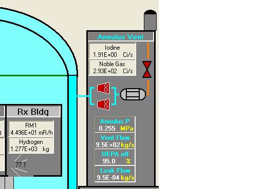 The radiation monitors’ readings and release source terms of noble gases, iodine and heavy isotopes are displayed in each compartment. The data is saved and transportable to the software RadPuff for area dose projection.