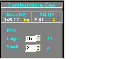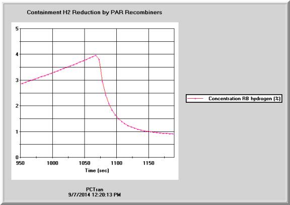 When hydrogen concentration in the containment is elevated to elevated level, operators may active a number of the PAR recombiners to reduce its concentration. In the transient figure below the concentration was increasing following a large break LOCA without ECCS with significant core damage and hydrogen in the containment. The operator turns on a number of recombiners, the concentration drops rapidly.